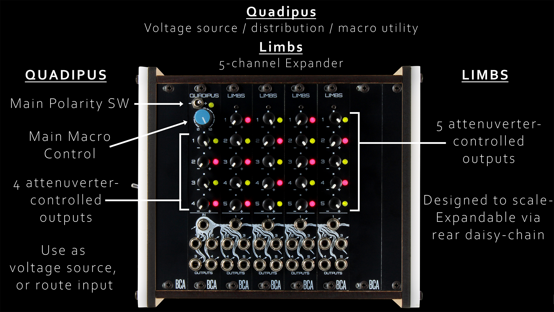Limbs features two 2-pin connectors on the rear of the module (input and output), allowing multiple Limbs modules to be daisy-chained together. This makes it possible to build a very large distribution and macro control system from a single Quadipus.
