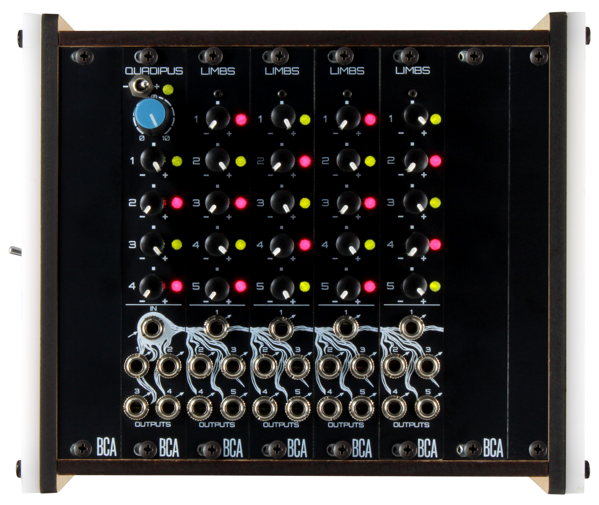 Limbs is an expander module for Quadipus, adding five additional output channels to the system. Like Quadipus, each output provides independent attenuverter control for level and polarity.